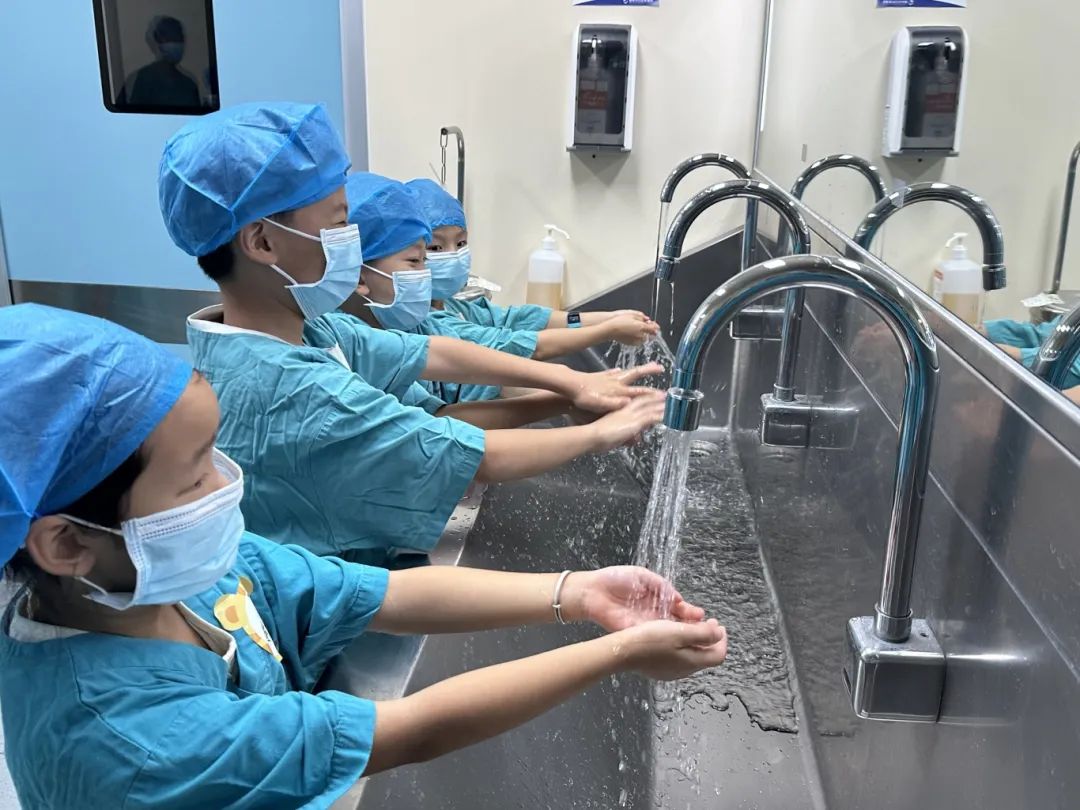 进入手术室的第一道“关卡”,就是严格的洗手消毒程序。护士阿姨化身为“泡泡魔法师”,带领孩子们体验专业的外科洗手。当丰富的泡沫在手上跳跃,孩子们在游戏中理解了“无菌”的重要性,明白了这是守护病人健康、也是守护爸爸妈妈工作的第一步。